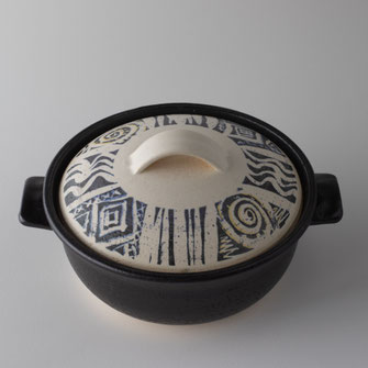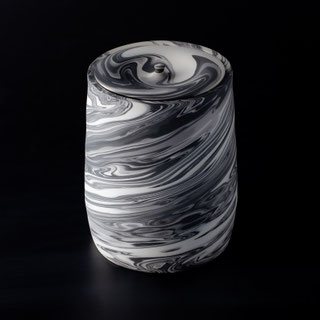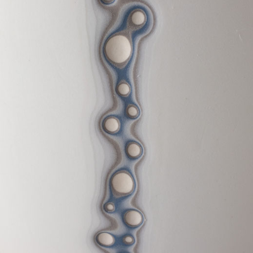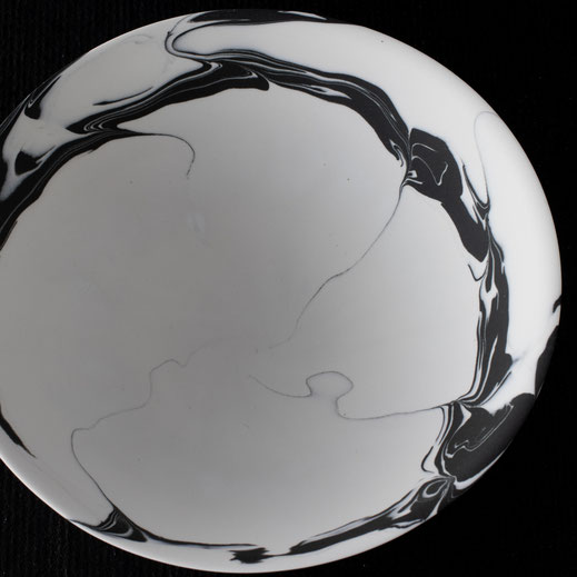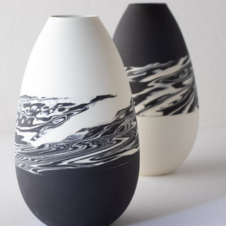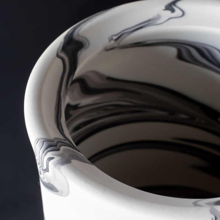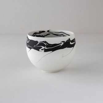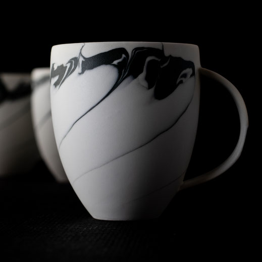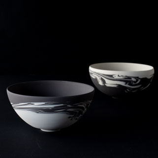 色の異なる磁土を一緒に練り合わせて成形し、全体を削ってゆくと、様々な模様が表出してきます。