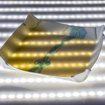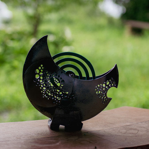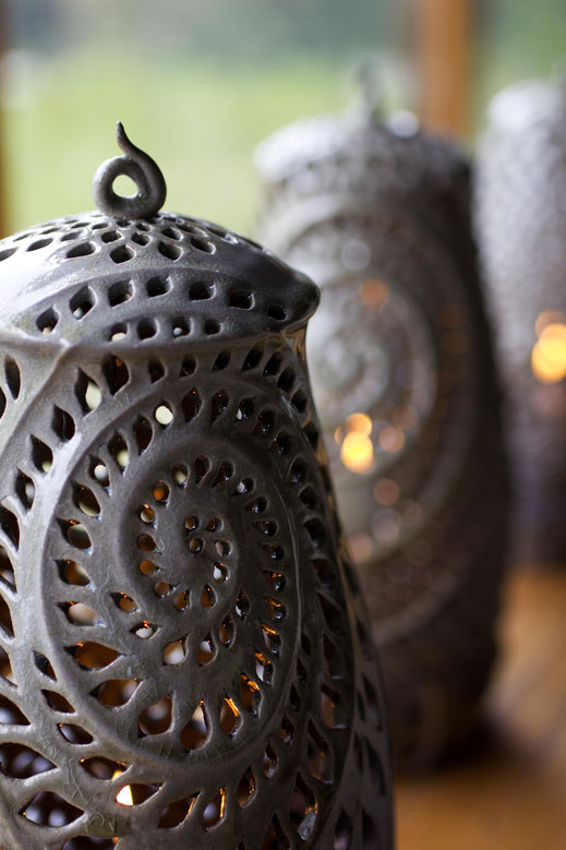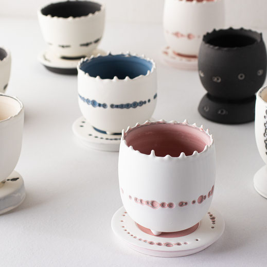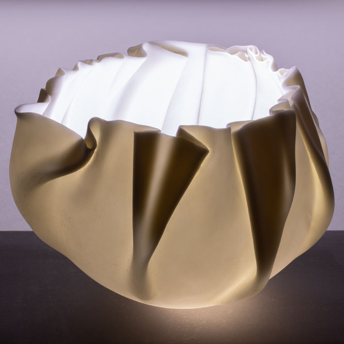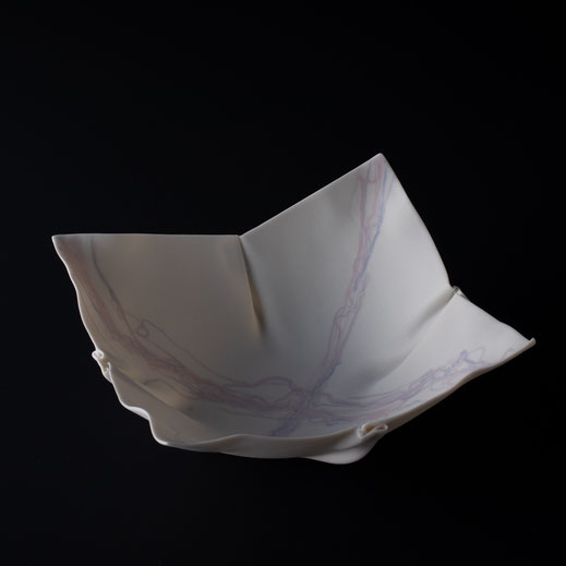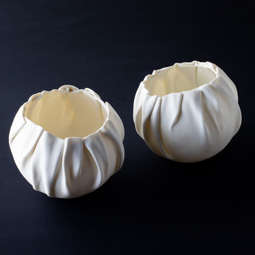 薄く軽い造り、ユニークなフォルムの作品を模索しています。透光性の高い磁土は、光の下で色々な表情を見せます。